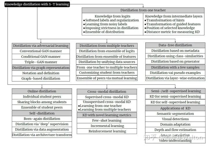 下面介绍今年的两篇survey文章,引用他们的Roadmap图,回顾下过去6年,研究者主要在哪些方向参与KD的研究和推进工作。