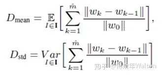 Dmean平均值和Dstd标准差。作者首先定义了一个参数叫weight distance ,weight distance是定义 to measure the learning effect at 第几个epoch,k代表不同的epoch number 。w0 代表初始参数wk 代表在k个epoch之后的参数。 代表