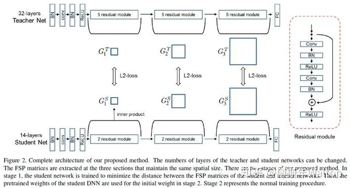 1.最小化teacher模型FSP矩阵与student模型FSP矩阵之间的L2 Loss,用来初始化student模型的可训练参数。