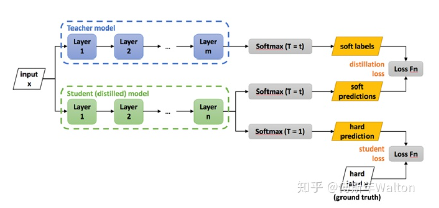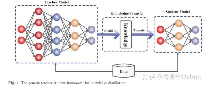 一个典型的KD框架如下图所示,由三个part组成,Teacher model,student model 和Knowledge transfer,整个过程是在有监督的data数据集上训练完成。