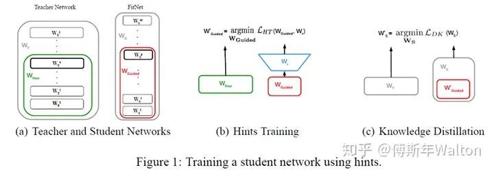 1. 选择teacher模型特征提取器的第N层输出作为hint,从第一层到第N层的参数对应图中的Whint;