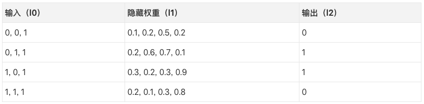 因此,在上表的4个训练样本中,第一个输入与输出之间的权重将持续增加或保持不变,而其他两个权重将发现自己在不同的样本上一会儿增加,一会儿下降(因而无法取得进展)。这一现象导致我们的网络基于输入和输出之间的相关性进行学习。