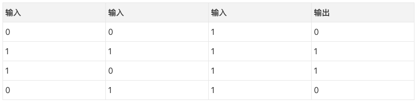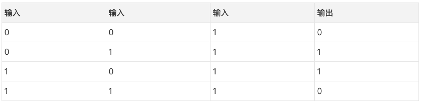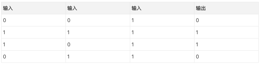 那么,模式是什么呢?看起来结果完全和第三列无关,这一列的值永远是1. 然而,第1列和第2列组合起来看比较清楚。如果第1列和第2列有一列是1(但两列不同为1!),那么输出是1. 这是我们的模式。