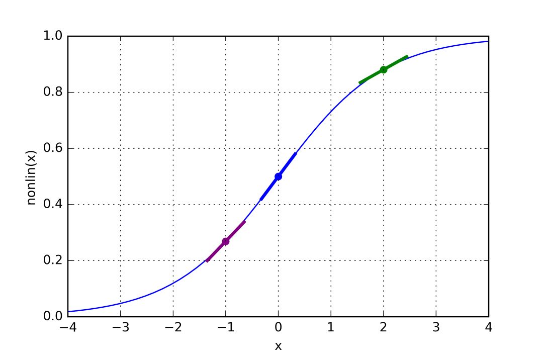 如果l1表示下图中的三点,那么上面的代码生成了下图曲线的斜率。注意,像x=2.0这样很高的值(绿点)和像x=-1.0这样很低的值(紫点)具有相对平缓的斜率。x=0(蓝点)处的斜率最高。这起到了非常重要的作用。同时注意所有的导数都在0和1之间。