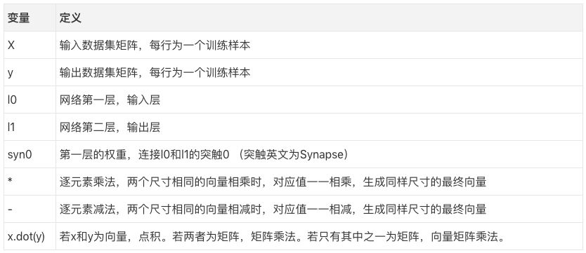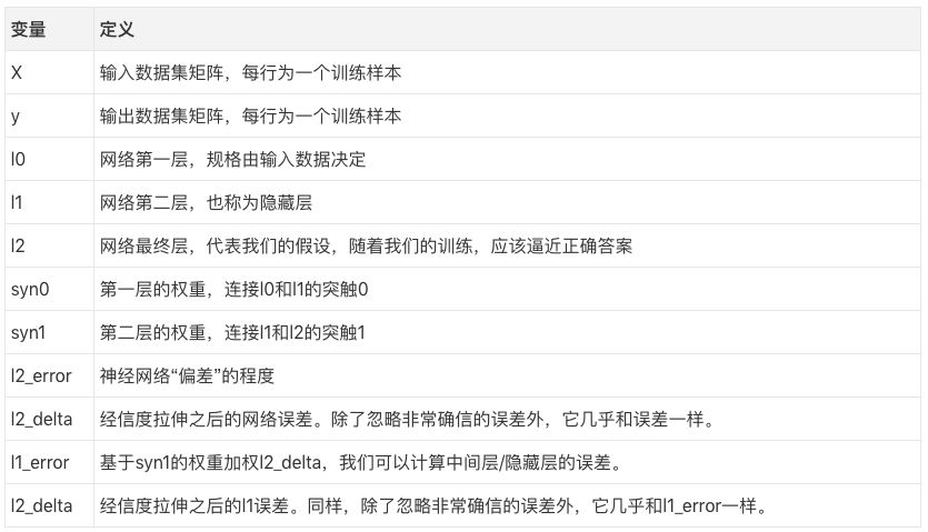 另外需要注意的是,“神经网络”实际上就是这个矩阵。我们有神经网络层l0和l1,但它们其实是基于数据集创建的短暂值。我们并不保存它们。所有的学习所得都储存在syn0矩阵中。