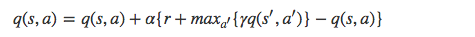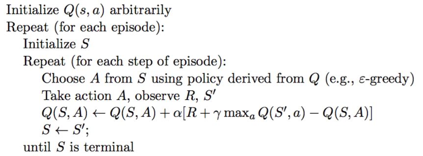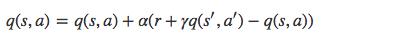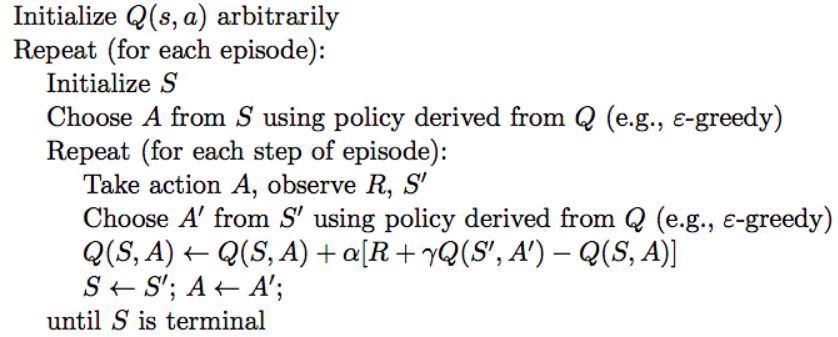 s 为当前状态,a 是当前采取的动作,s’ 为下一步状态,a’ 是下一个状态采取的动作,r 是系统获得的奖励, α 是学习率, γ 是衰减因子。