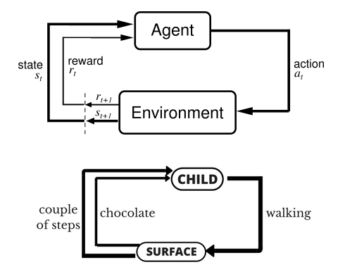 小孩就是 agent,他试图通过采取行动(即行走)来操纵环境(行走的表面),并且从一个状态转变到另一个状态(即他走的每一步),当他完成任务的子任务(即走了几步)时,孩子得到奖励(给巧克力吃),并且当他不能走路时,就不会给巧克力。