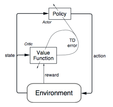 算法分为两个部分:Actor 和 Critic。Actor 更新策略, Critic 更新价值。Critic 就可以用之前介绍的 SARSA 或者 Q Learning 算法。