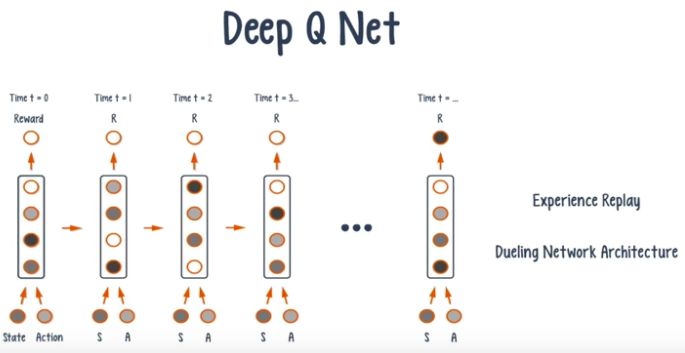 DQN 算法的主要做法是 Experience Replay,将系统探索环境得到的数据储存起来,然后随机采样样本更新深度神经网络的参数。它也是在每个 action 和 environment state 下达到最大回报,不同的是加了一些改进,加入了经验回放和决斗网络架构。