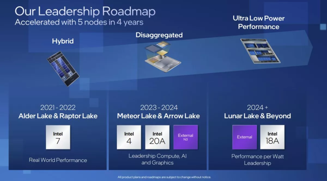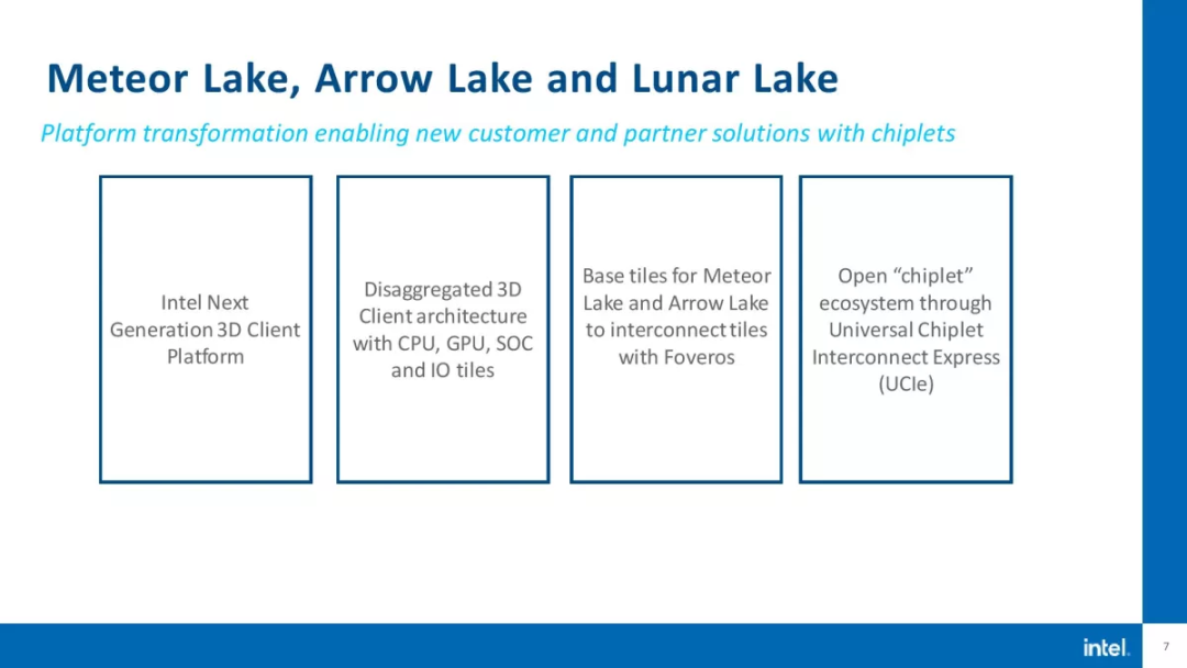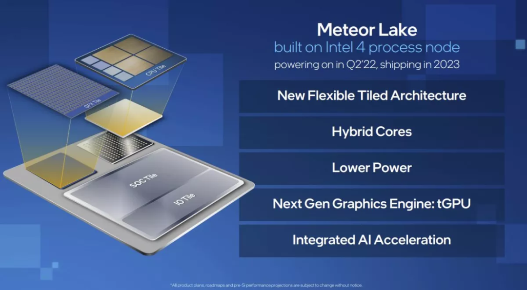 这种区别最终将会在芯片成品中体现,英特尔表示新款 3D 堆叠芯片 Meteor Lake 有望在 2023 年推出,Arrow Lake 和 Lunar Lake 将在 2024 年上市。