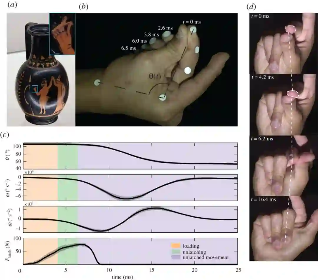 图|(a)公元前 320 年左右的一件陶器,描绘了打响指的画面;(b)从侧面看,打响指时在不同时间点的运动合成图像;(c)在手腕、指关节和指尖三处进行测量(d)响指运动图示。