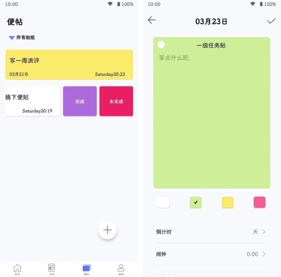 除了写日记外,无忧日记也将日常任务便贴作为了主要功能,用于记录日常的零碎事项。为了区分不同事项的重要程度,无忧日记将便贴分为了临时记录贴、一二三级任务贴 4 类,不同级别的便贴以不同的颜色加以区分。其中,临时记录贴只有倒计时属性,而任务贴则额外支持闹钟提醒。便贴支持标记为完成/未完成,为了数量化用户的任务完成情况及完成数量,无忧日记又引入了「能动值」这一概念,能动值同时受到情绪值和任务完成情况的影响。