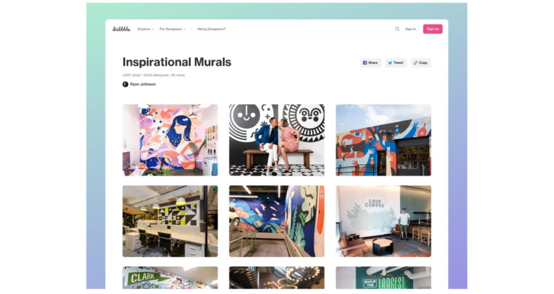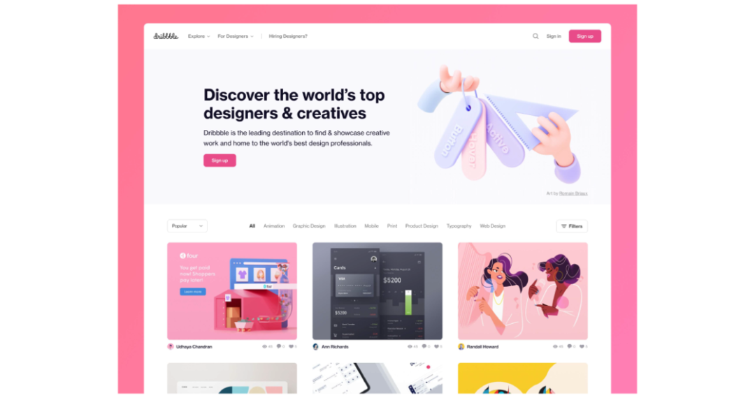 更新后的 Dribbble 最大的视觉变化在于更接近于现代设计潮流,界面简洁并有着统一的布局和视觉系统,更简化的交互让你更容易找到自己想要的作品以及功能。