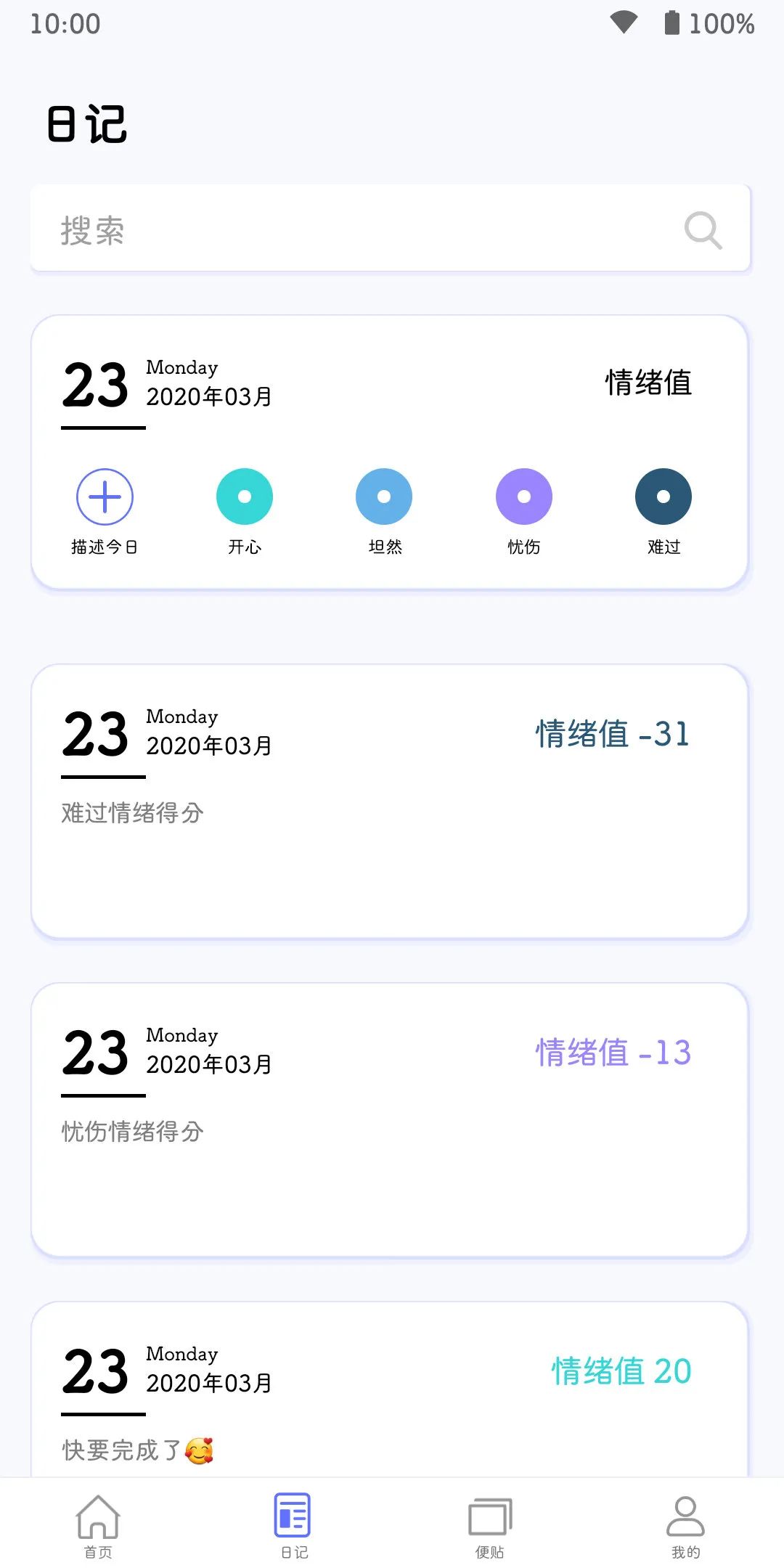 相比于其他日记类 app,今天介绍的这款无忧日记更加注重「情绪」记录,根据用户所选择的情绪不同,最终得到的情绪值也会不同,正性情绪记录为正值,负性情绪则记录为负值,最终情绪值会以每日情绪报表的形式展示在首页,方便用户了解自己的情绪波动状况。