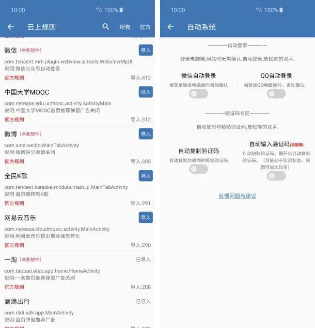 除了用户手动添加规则,Auto tool 还内置了一个规则分享平台,对于尚未在该应用内适配的 App,官方或其他用户可以在平台内分享规则,相比其他产品需要更新 App 进行适配的方式更加迅速,而这种方式也让 Auto tool 不局限于跳过「开屏广告」,例如关闭 B 站客户端青少年模式提示、关闭微博瀑布流广告甚至打开网易云自动点击播放按钮,Auto tool 都可以凭借云上规则完成。不过目前规则数量较少,需要开发者和用户持续分享。