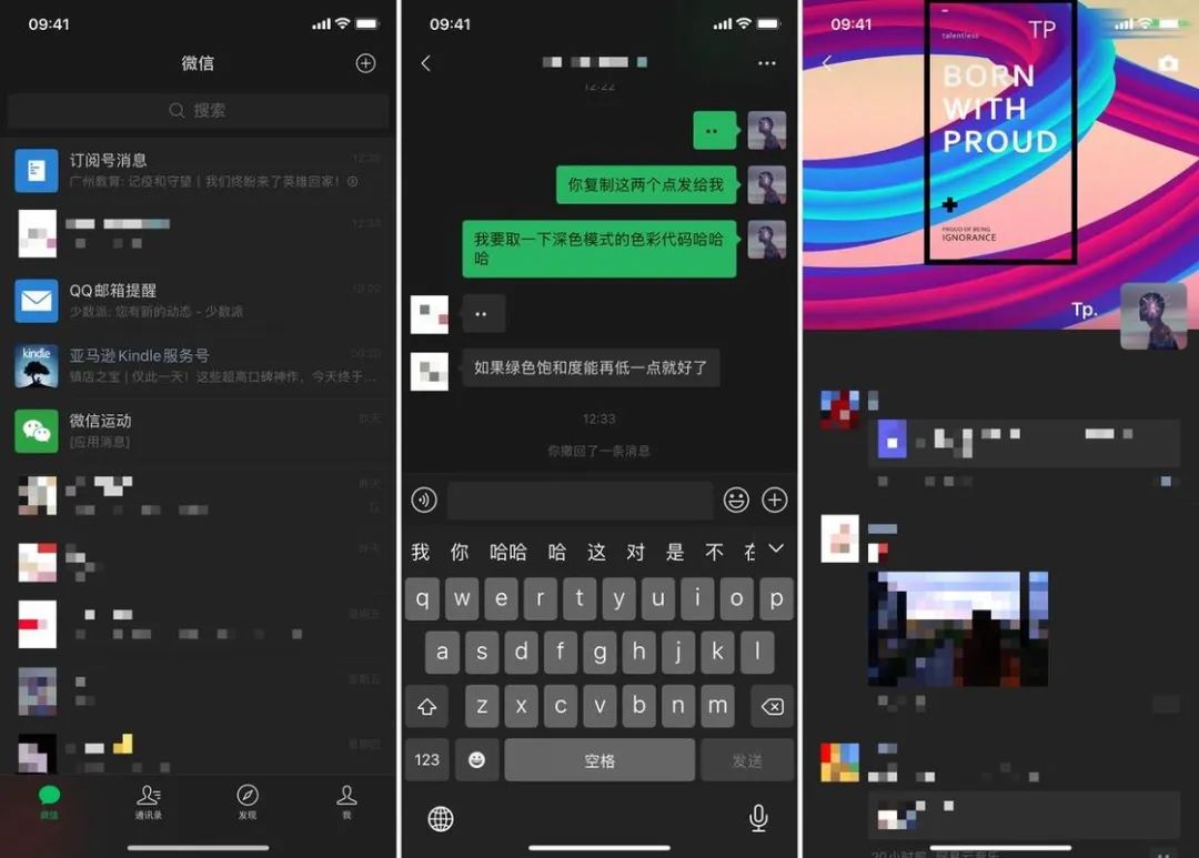 🕵🏻 Tp:万众期待的 微信深色模式终于上线 了。微信的深色模式并不是单纯「换个黑色主题」这么简单,而是深灰色背景 + 浅灰色菜单。聊天界面也针对深色模式进行了优化,即使你使用的是自定义背景,微信也会自动为你降低背景亮度。