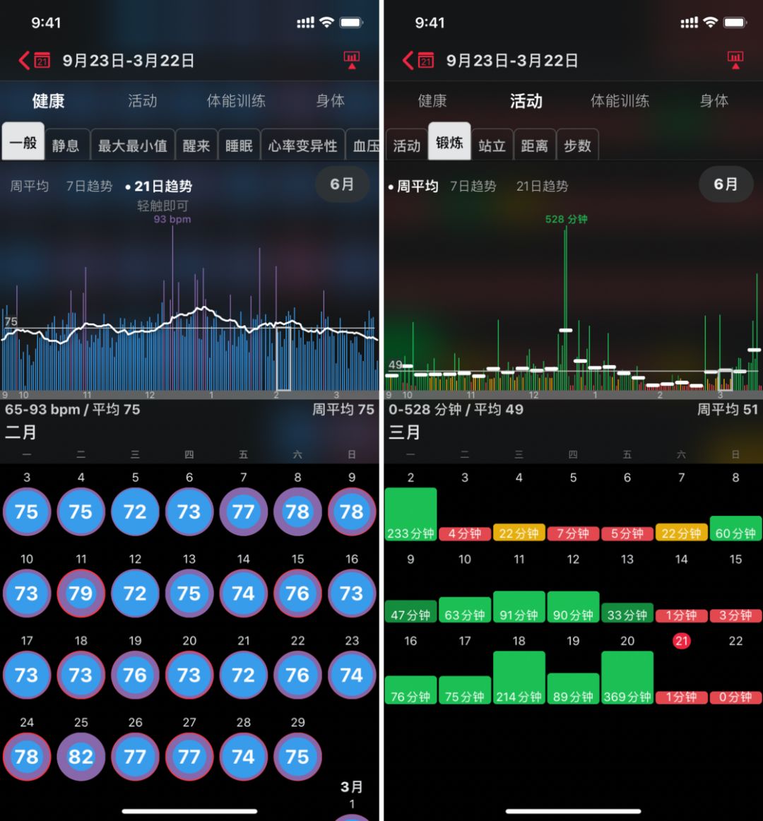 相比于系统自带的健康应用,HeartWatch 支持对心率、血压、睡眠、体能训练等数据的多维度分析和数据可视化,并支持最多查看 12 个月的历史数据趋势。