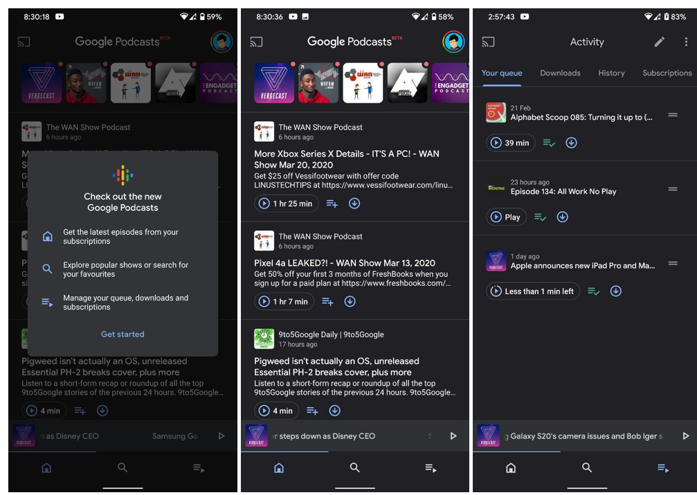 Google Podcasts(Android):近期开始向部分用户推送经过全新设计的新版本。新版采用更易操作的底栏菜单设计,同时加入了新剧集上线通知和自动下载功能。