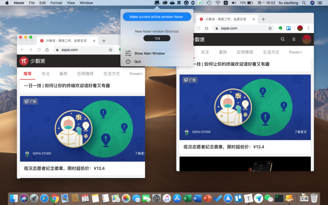 👨🏻💻 化学心情下2:有时我们在 Mac 上开启多个软件之后,往往会出现一些经常使用的软件被放在桌面最下面,就会遇到反复窗口的情况,显然在需要高效率的场景下非常不方便。