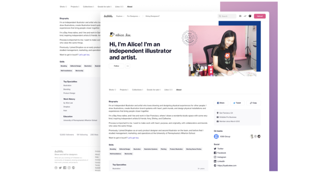 而对于设计师而言,最大的变化可能来自个人主页,对于 Dribbble Pro 用户,新的个人主页可以上传自己的标题图像以及自定义的欢迎文本,让自己的主页看上去更具个性,而在「关于」部分则对个人资料进行了统一,可以非常方便地展示你的简历信息。