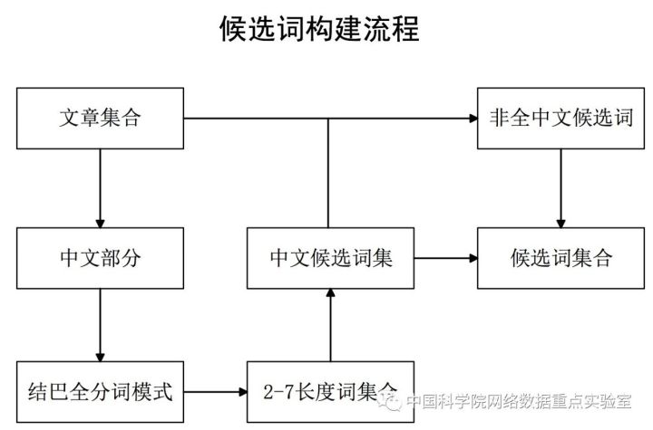 给定若干用户文档(博客或帖子),参赛者需要为每一篇文档生成3个最合适的主题词。要求生成的主题词必须出现在文档中。该任务的难点在于内容主题词是一个相对开放的空间域,候选词集合的范围非常大,与此同时主题词的生成不同于常见的机器学习场景,无法直接应用传统的分类/回归模型。如何在这样开放的候选词中生成文章对应的主题词并充分利用训练数据的标注信息,是该任务的一大关键点。NASC@ICT团队通过构建高覆盖率、低存储代价的特定候选词集合,将传统的无监督的主题词生成模型转换成一个在特定候选词集合上的二分类问题。特定候选词集合的构建过程如下图所示,最终共构建了301,076个候选词,覆盖达到92%的标注主题词。