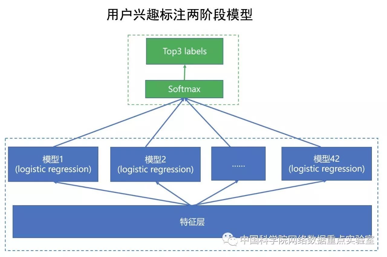 在第一阶段,独立的42个二分类模型并行训练生成,然后将这42个二分类模型的结果作为第二阶段的输入,训练softmax分类器。该两阶段模型在线上测试集达到了44.9%的准确率,有效地解决了训练样本过少,模型容易过拟合的问题。
