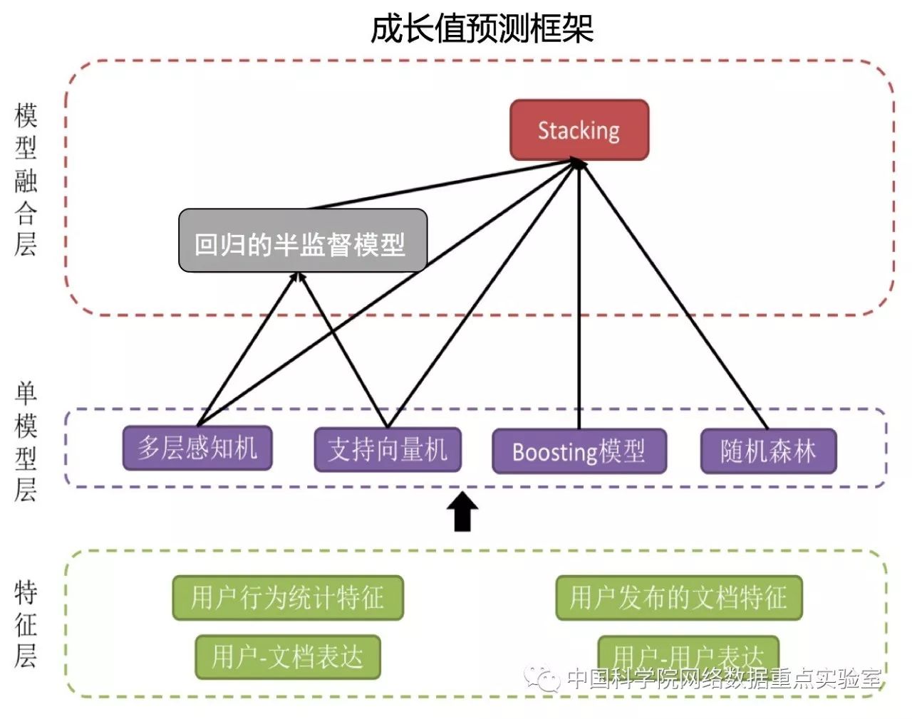 给定若干用户在一段时间内(至少1年)的文档信息(博客或帖子)和行为数据(浏览、评论、收藏、转发、点赞/踩、关注、私信等),参赛者需要预测每一个用户在未来一段时间内(半年至1年)的成长值。如何在CSDN这样一个开放系统下,预测用户未来的行为以及相应的成长值一个非常难的问题。加之带标签数据也较少,用户行为本身就有一定的不可预测性,更使得该任务非常具有挑战性。NASC@ICT团队提出通过回归的半监督模型+Stacking框架来增加带标签数据,解决标注数据过少的问题,增强模型的泛化能力。同时,提取了包括用户行为、用户发布的文档、用户表达等多种维度包含多种信息的特征,来捕获开放系统下的众多影响因素。模型的整体框架如下图所示。最终模型在线上验证集的成绩为0.76,在为期30天的比赛赛程中一直占据排行榜首位。