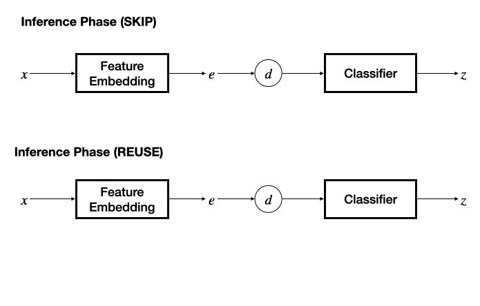 在推理阶段,若采用 SKIP 机制,则将另一个输入的特征固定为零,退化为基本的分类器,根据预测的冗余性标签决策是否跳过当前输入数据;若采用 REUSE 机制,则需要维护一个 “输入特征 - 推理输出” 表作为缓存,通过计算当前输入特征与缓存的输入特征之间的距离,采用 K - 近邻方法决策是否重用缓存的推理结果。