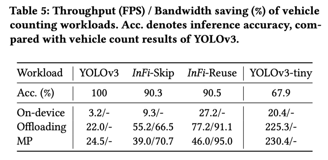 以在城市道路监控视频中进行车辆计数的任务为例,在端上推理时,相较于原始的工作流,采用 SKIP 和 REUSE 机制的 InFi 方法分别能够将推理吞吐提升 1.9 和 7.5 倍,同时皆保持超过 90% 的推理精度;在进行端 - 边模型切分推理时,两种机制下的 InFi 分别能够节省 70.7% 和 95.0% 的通信带宽。