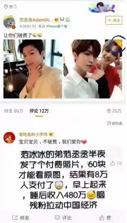 4 月 26 日,范丞丞的一条微博引发了社交讨论。范丞丞是范冰冰的弟弟,微博上拥有 300 万左右粉丝的明星大 V,是少女们心中炙手可热的偶像节目《偶像练习生》中的偶像选手,而引发巨大讨论的是他发表的一张“付费阅读”的照片。