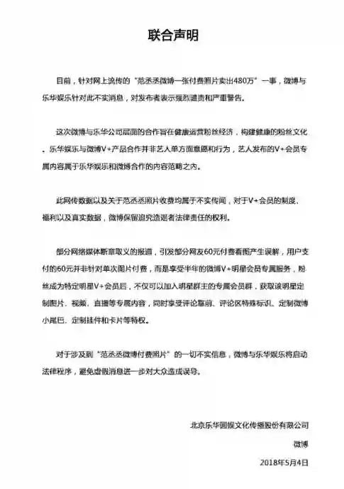 至于微博官方以及范丞丞自己和公司倒是也没有确认过这个数据,微博上昨天发出了一个公告,提到了这个合作,强调了V+会员的功能,否认了这个数据: