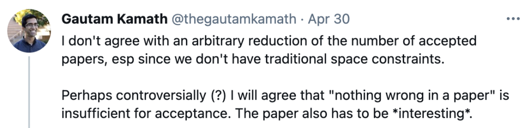 「我同意论文没有错确实不足以被接收,论文也应该有趣。但我不同意减少接收论文的数量,尤其当我们没有传统的空间限制时。」
