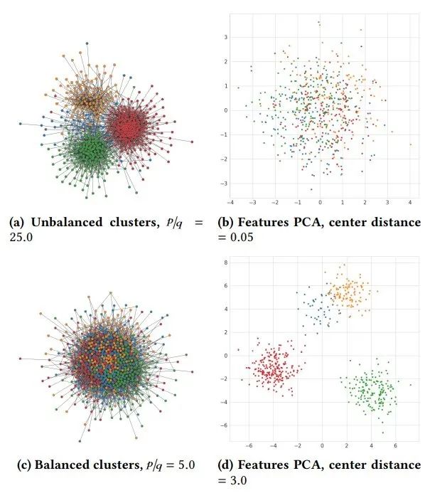 举例来说,对图样本的采样可以根据节点特征是否为一个聚类集合来划分,即p-to-q ratio。这里p和q分别表示边连接的两个节点是否被聚类成同一类别。如图所示可以直观的看出根据p-to-q ratio 划分出来的图结构: