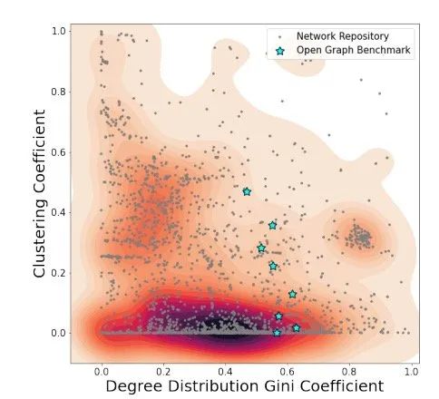 首先,图数据的benchmark大多分布相似,因此,训练出来的图网络大概率是只能针对某种数据的网络。而现实中的图网络又不一定符合benchmark里面的样子,所以直接导致在benchmark里能顺利训练出来的图结构不一定能符合真实场景。这里做了一个简单统计: