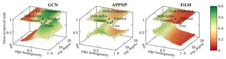 基于以上想法,作者提出了GraphWorld这种合成的通用Benchmark来衡量模型在图网络上的效果。首先做一个简单测试,作者设了一些合成数据,并且把现在已有的数据集也映射到了这些合成数据集的分布里面。x和y轴分别表示图数据的同质性和出入度,z表示一些经典模型与其他baseline模型预测精度对比(MRR指标, mean reciprocal rank)从这个简单实验上可以看出来,GNN模型在不同数据集上实际上是有明显差异的,尤其是在不同的虚拟数据集上。由于这些都是虚拟数据,所以现在数据已经在TF-GNN上更新开源了。由此可见,仅仅依靠现在广泛使用的图网络benchmark是有局限性的。