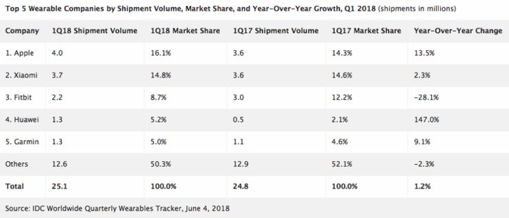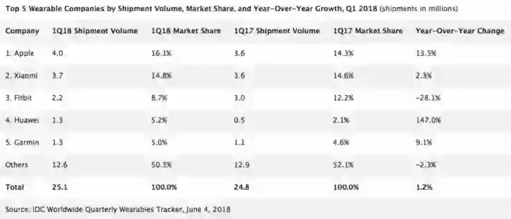据IDC数据显示,在今年第一季度的可穿戴设备货运总量中,手表和腕带的货运总量占比95%,全球可穿戴设备的货运总量增长为1.2%,数量为2510万件,其中出货量排在前五的分别为苹果、小米、Fitbit、华为、Garmin,谷歌由于迟迟没有推出自家智能手表,在整个市场中仍然找不到其“实体”。