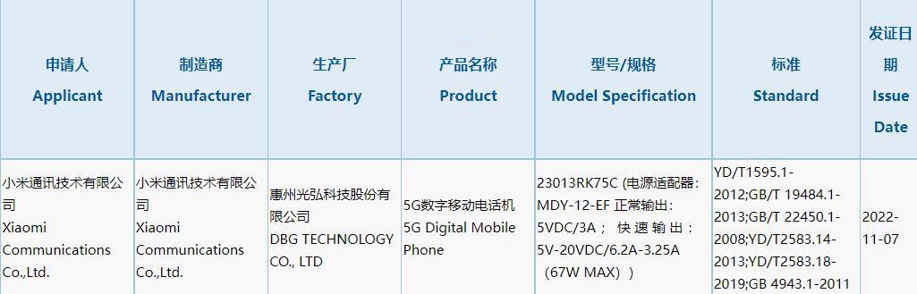 小米 Redmi K60 标准版昨日通过国内 3C 认证,型号为 23013RK75C,充电器型号为 MDY-12-EF,支持最高 67W 快充。据此前爆料,Redmi K60 标准版预计将搭载天玑 8200 芯片,这款手机还将采用带有光学防抖 OIS 的 4800 万像素摄像头,且配备 QHD + 分辨率的采用国产护眼柔性直屏,采用居中打孔。