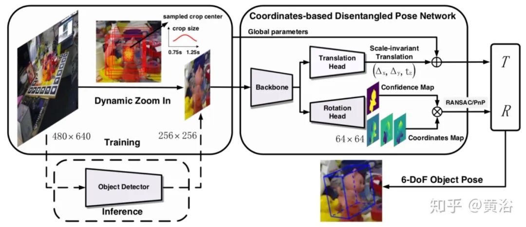 其步骤如图所示,给定输入图像,先放大目标,然后解开旋转和平移以进行估计。具体而言,旋转是通过PnP从预测的3D坐标中解决的,而平移则直接从图像中估算出来。