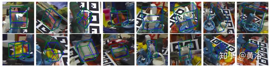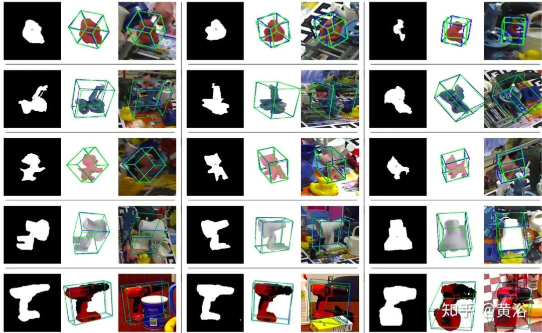 下图是一个姿势估计过程的示例。图像和二维检测结果作为输入。第一阶段,预测结果用于指定重要像素并调整边框,同时去除背景和不确定像素。第二阶段,有效坐标值和较小误差预测的像素,用附加RANSAC的PnP算法来估计姿态。结果中,绿线和蓝线表示真实姿势和估计姿势的目标3D边框。
