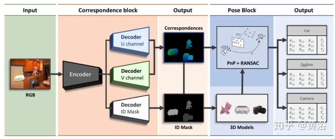 给定输入的RGB图像,具有编码器-解码器神经网络的对应块回归目标ID掩码和对应图。后者提供了明确的2D-3D对应关系,而目标ID掩码则估算了每个检测目标应采用的对应关系。然后,姿势模块基于PnP + RANSAC有效地计算各个6D姿势。