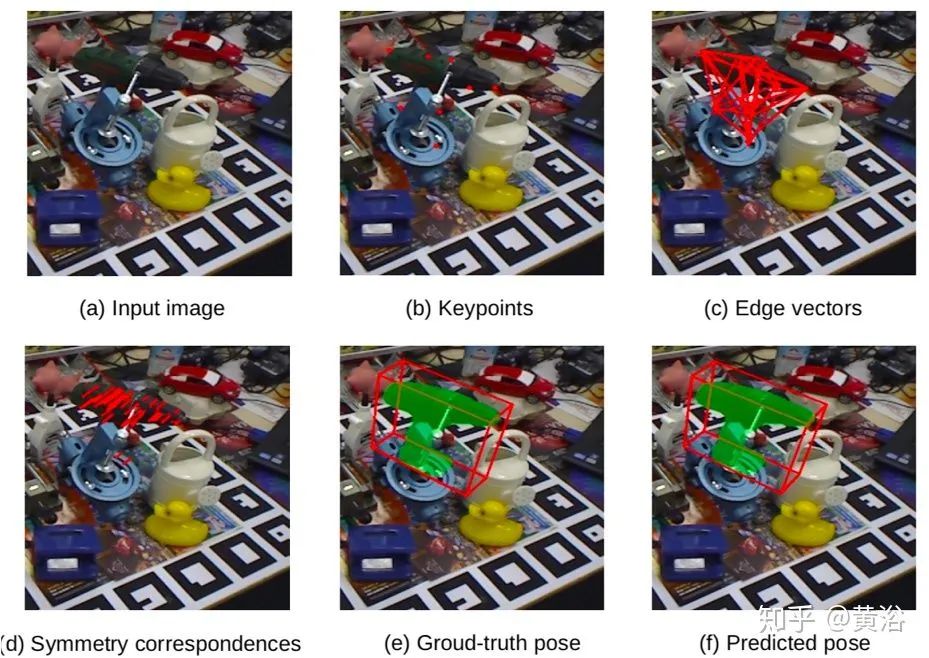 如图所示是HybridPose运行的直观图:(a)输入RGB图像;(b)红色标记表示预测的2D关键点;(c)边缘向量由所有关键点之间的完全连接图定义;(d)对称对应关系将目标上的每个2D像素连接到其对称的对应目标。
