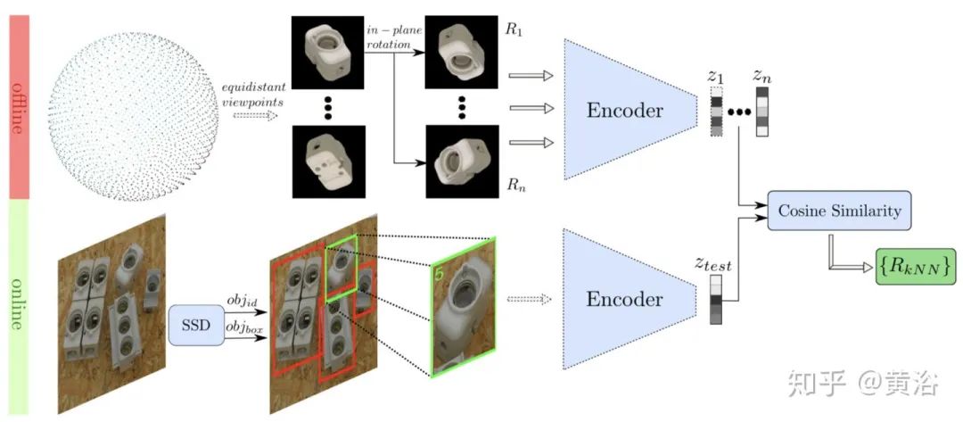 由于训练独立于SO(3)中目标方向的具体表示(例如四元数),因此避免了从图像到方向的一对多映射,能够处理由对称视图导致的歧义姿势。