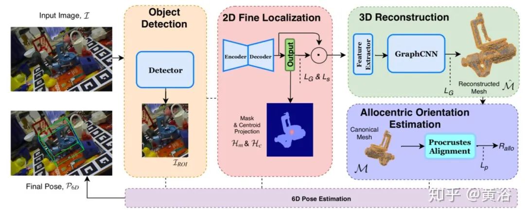 在规范和重构密集3D网格之间可微分地计算Procrustes对齐(Procrustes’ alignment),可恢复同心圆朝向(allocentric orientation)的估计。使用附加模版和2D质心投影,自中心姿势(egocentric pose)估计可以提升到6D。通过测量重构网格的质量可验证其姿势估计。