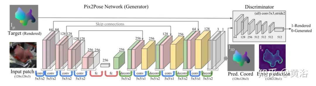 网络输出是目标坐标中每个像素的标准化3D坐标以及来自Pix2Pose网络每个预测的估计误差。目标输出(target output)通过在真实姿态下绘制彩色坐标模型,可以轻松导出真实输出。