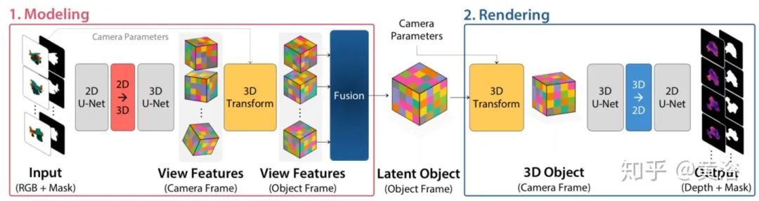 给定一组具有相关联的目标姿态和目标分割掩码的N个参考图像,它试图构建可以用任意相机参数渲染的目标表示。将目标表示为潜在的3D体素网格,可使用标准3D转换直接对其进行操作-自然地可以满足新视图渲染的要求。重建流水线有两个主要组件:1)通过预测每个视图的特征容量并将其融合为单个规范的潜在表示对目标建模;2)将潜在表示渲染为深度和彩色图像。