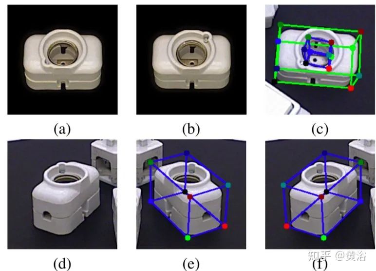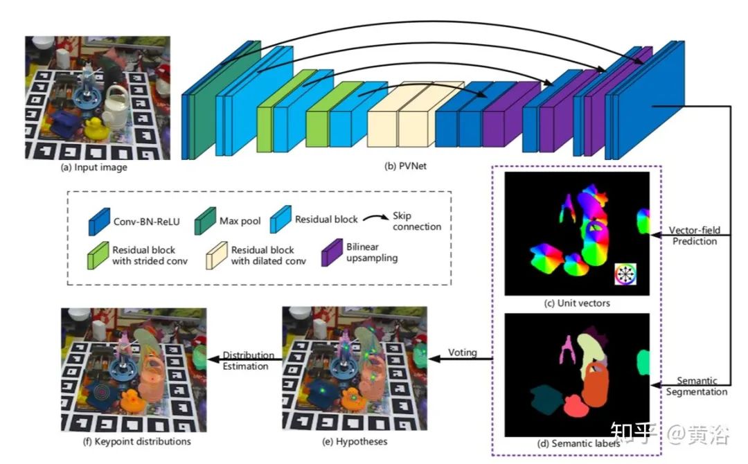 如图是关键点定位的概述图:(a)输入图像。(b)PVNet的架构。(c)指向目标关键点的逐像素单位矢量。(d)语义标签。(e)通过投票产生的关键点假设。(f)根据假设估算的关键点位置的概率分布。