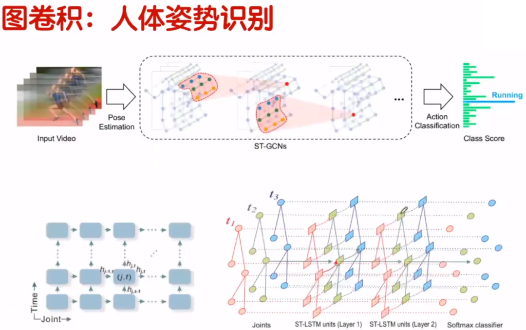 如下图所示,输入了一个视频信号,视频信号上有时间序列,每一个时间序列上就是一张图片。针对每一张图片,我们可以构建骨骼图,然后通过时间顺序找到每一个节点的位置把它们连接起来,然后就变成了一张大的图,把这个大的图放到GCN里面进行训练,最后到一个分类器里面,预测分类结果。下图的分类结果是跑步。