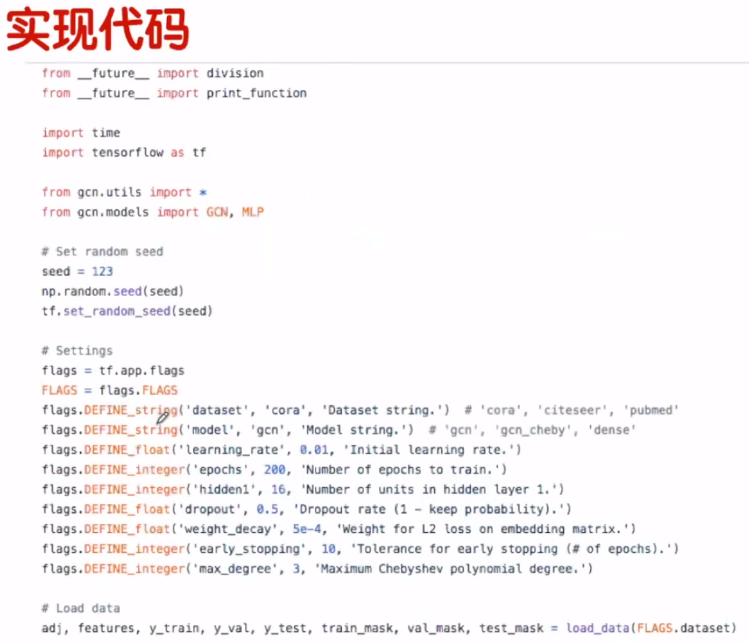 有了半监督图分类的损失函数后,我们来看一下如何用代码实现。下图展示了部分核心代码。
