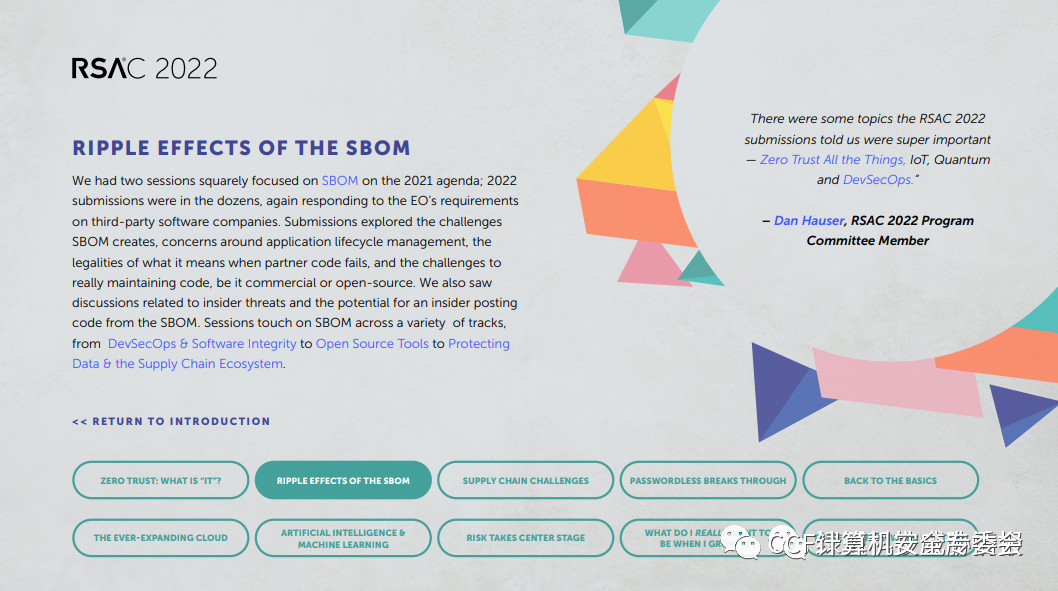 软件物料清单 (SBOM) 是代码库的完整清单,包括开源组件,这些开源组件的许可证和版本信息,以及这些组件中是否存在任何已知漏洞。RSAC2022大会则提交了数十份材料,主要围绕讨论如何约束对第三方软件公司的要求。其中值得注意的是,围绕供应链应用程序的生命周期管理,当合作伙伴的代码挂起引发的连锁反应,以及维护代码所面临的挑战等,议题还触及了从DevSecOps和软件完整性到开源工具,再到保护数据与供应链生态系统等方面。