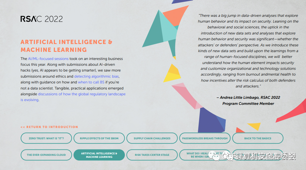 虽然人工智能和机器学习是一个老生常谈的话题,2022RSA大会则出现了围绕AI/ML为重点的焦点议题。除了关于人工智能驱动的黑产(是的,人工智能似乎越来越聪明),还有很多关于道德伦理和检测算法偏差的议题讨论,以及关于,如果我们不是数据科学家的时候,我们如何能很快速地获得业务服务指导。在这个板块,大会还将同时讨论全球监管格局如何演变,以及AI/ML的实际应用情况。
